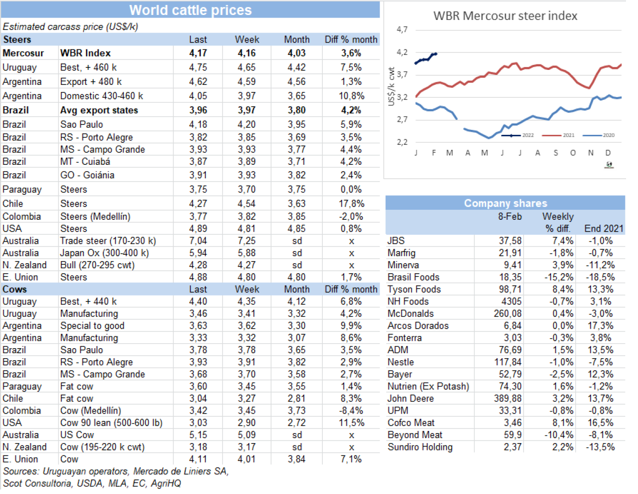 根據(jù)美國機構(gòu)的預(yù)測,Marfrig在與瑞士信貸的一次會議上表示,今年美國活牛的供應(yīng)將同比下降2%。Marfrig認為,美國的畜牧業(yè)周期正在發(fā)生變化。事實上,美國的肉母牛存欄量在2021年底達到了過去7年來的最低水平。Marfrig預(yù)測隨著供給的下降,美國牛價將有10%-15%的上漲,這意味著其在美國的National Beef業(yè)務(wù)利潤下降?!?span>Marfrig沒有給出預(yù)測,但我們應(yīng)該會看到利潤率下降。最近,一個競爭對手公開了它的預(yù)測,我們估計該公司的Ebitda利潤率為12%。從歷史數(shù)據(jù)上看,我們的EBITDA利潤率高于該競爭對手,”投資者關(guān)系總監(jiān)Eduardo Puzziello表示。盡管如此,Marfrig的總經(jīng)理Miguel Gularte說,由于“國內(nèi)需求強勁,出口增長,特別是對中國的出口增加,利潤的下降應(yīng)該會趨于穩(wěn)定,緩沖北美的牛周期造成的利潤下降?!?/span> 對巴西來說,牛周期的階段正好相反。他說:“2022年的牛供應(yīng)量肯定會高于過去三年,我們已經(jīng)開始看到這種周期逆轉(zhuǎn)的開始。”在投資方面,公司必須將部分資本支出(資本貨物投資)分配到巴西,并將屠宰量增加20%。此外,據(jù)Tradersclub報道,Marfrig計劃在巴拉圭開設(shè)一家新工廠,該工廠應(yīng)在今年下半年開工后的16-24個月內(nèi)開始運營。