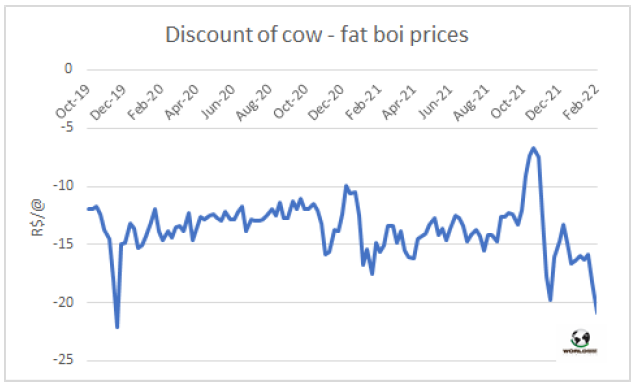 由于對中國出口的緊迫需求使可以出口到中國的30月齡以下的小公牛價格與母牛價格的價差拉大。圣保羅州可以對中國出口的小公牛采購價要高出15雷亞爾/15公斤。反過來,育肥母牛與育肥公牛之間的價格差擴大到20雷亞爾/15公斤,這是自2019年11月以來的最大差距,當時對中國出口也有非常強烈的需求。相反,當巴西暫停對中國的出口時,母牛與公牛之間的價格差距縮小到8雷亞爾/15公斤。一周內(nèi),育肥牛價格小幅下調(diào),而批發(fā)市場后部位肉價格保持穩(wěn)定,而前部位肉價格則有所上漲。