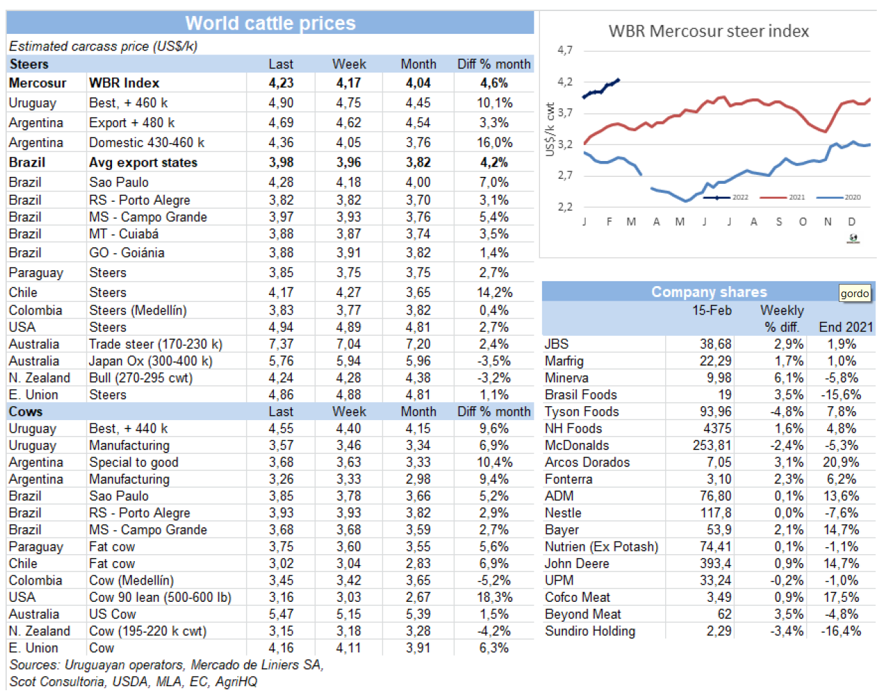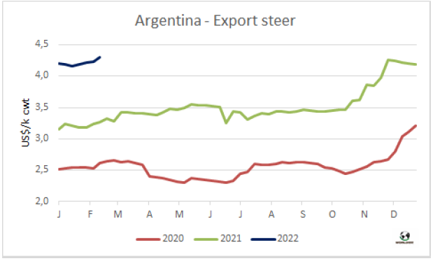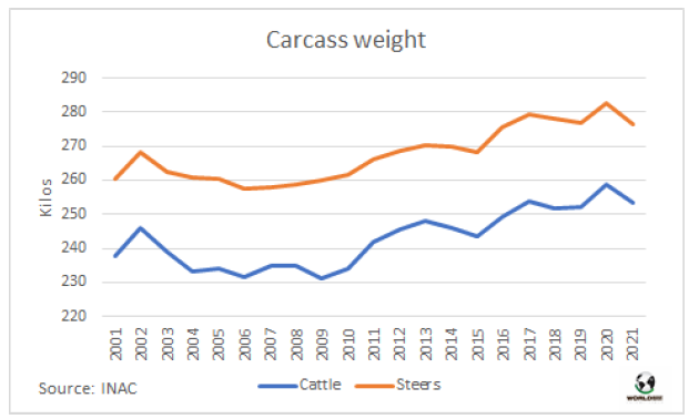 根據ABC出口商會的一份報告,去年待宰牛平均體重有所增加:母牛平均胴體重量為每頭210公斤,公牛的平均胴體重量為每頭246公斤,均高于2020年數據。對于ABC來說,由于“穆尼屠宰量減少和較輕動物數量減少”,平均體重為每頭228公斤,比2020年增長了2公斤。2022年的第一個月,這一數值再次被超越,達229公斤,盡管報告稱這 “與我們的競爭對手相比仍有很大差距”。
