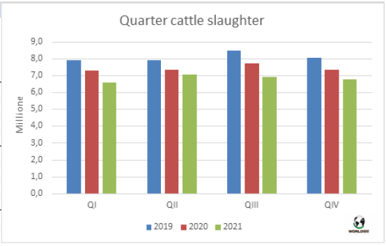 初步數據表明2021年第四季度牛屠宰量下降了8%