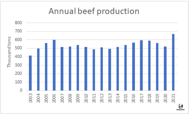 2021年創(chuàng)紀錄的牛屠宰量決定了牛肉產量大幅增長,達66.8萬噸,創(chuàng)歷史最高紀錄,同比增幅為28.7%。牛肉產量比2006年的最高紀錄高出6.9萬噸。牛屠宰量較2006年增加了不到5萬頭,增幅為1.9%,胴體重量增加了21.8公斤增幅約9.4%,因此牛肉產量比之前的記錄高出了11.5%。