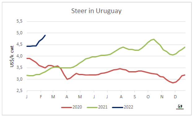 上周牛屠宰量保持高水平。烏拉圭肉協報道截止2月12日當周牛屠宰量53653頭,較上周下降了300頭,同比去年同期增長了26%。閹牛屠宰量30058頭,較上周增長了10%,小母牛屠宰量急劇下降了31%至5818頭,母牛屠宰量16886頭,較上周下降了2%。屠宰活動最活躍的工廠是Las Piedras(379廠),屠宰量5,338頭, Ontilcor (439廠)屠宰量4,109頭, 其次是Marfrig-Tacuarembó(12廠) 屠宰量3,851頭。Marfrig四家屠宰廠屠宰量13602頭,較上周增長了725頭,美麗華三家屠宰場屠宰量9785頭,較上周下降了1022頭。2月前12天牛屠宰量共計98015頭,較2021年同期增加了2.1萬頭,增幅為21%。