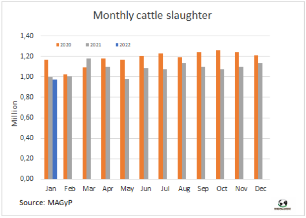 1月阿根廷牛屠宰量約97.2萬頭,較上月下降了14%,較去年1月下降了3%。2021年五月牛肉出口因罷工被禁時的屠宰量沒有低于上月。2021年2月至2022年1月牛屠宰量達1284萬頭,同比下降了7%,母牛的比例為45%。
