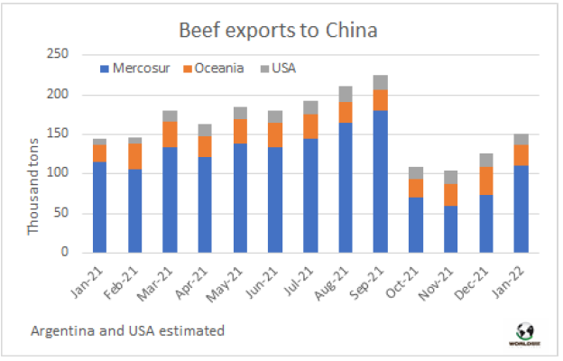 隨著2月中旬中國市場對巴西牛肉解禁,巴西對中國牛肉出口量穩(wěn)步增長。據估計,今年1月,南美洲、大洋洲和美國向中國出口了約15萬噸牛肉,比去年12月多出了約2.5萬噸,比去年11月多出了近5萬噸,而當時巴西的牛肉供應量幾乎為零。今年1月從南美市場發(fā)運的貨物約為11萬噸,由于巴西的重新回歸,較上月增加了3.7萬噸。澳大利亞和新西蘭1月的出口總量為25761噸,比去年12月的季節(jié)性高峰減少了9500噸。2月,對中國的出口量將繼續(xù)增長,接近2021年8月和9月達到的每月20多萬噸的峰值。