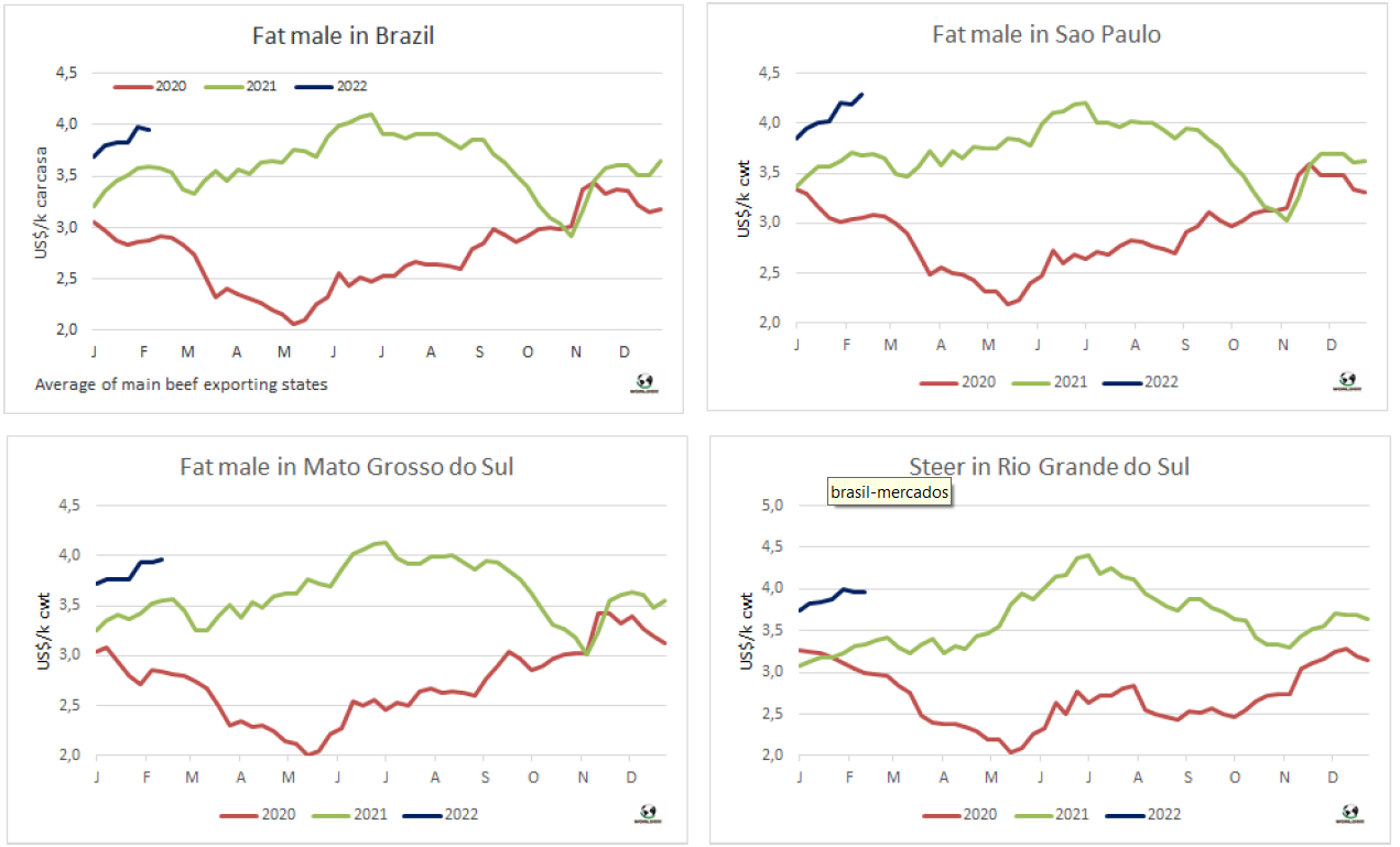 2月前兩周巴西牛肉出口量以驚人的速度增長,價格也穩(wěn)步上漲。外貿部報告顯示,2月的前9個工作日出口量73446噸,FOB平均價格5504美元/噸。平均每天的出貨量為8161噸,因此如果保持這個速度,2月的出貨量將超過15萬噸,比2021年同月高出50%以上。