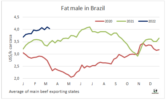 馬托格羅索州是巴西存欄最大的州,2月牛屠宰量和1月相比下降了8.2萬頭(-19%),同比也下降了 3000頭,屠宰量連續(xù)三個月的增長結(jié)束。Agrifatto稱,屠宰量下降的主要原因是公牛屠宰量較1月份下降了26.6%,只有18.36萬頭,是35個月來最低。該咨詢公司推測,屠宰量下降可能由于去年9月對中國出口暫停以及2021年最后一個季度待宰牛價格下降導(dǎo)致育肥進(jìn)程減緩。母牛屠宰量較上月減少8.6%,為16.47萬頭,母牛屠宰量在中占比增加到47.3%,為24個月來的最高水平。然而這些數(shù)據(jù)本身并不意味著今年待宰牛供應(yīng)增長趨勢的逆轉(zhuǎn)。