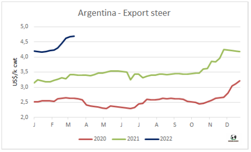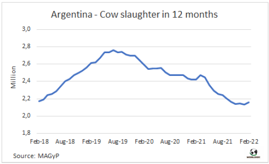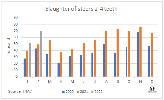 據(jù)農(nóng)業(yè)部估算,今年2月阿根廷牛肉產(chǎn)量23.2萬噸,2022年前兩個月產(chǎn)量合計(jì)45.4萬噸。單月看有所差異,但1-2月合計(jì)牛肉生產(chǎn)量與去年同期持平。2月人均消費(fèi)量51公斤,1-月人均消費(fèi)量48公斤,比2021年同期增長8%。
