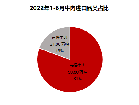 從牛肉進(jìn)口品項(xiàng)看,1-6月去骨牛肉進(jìn)口量90.8萬(wàn)噸,占比81%。帶骨牛肉進(jìn)口量21.8萬(wàn)噸,占比19%。