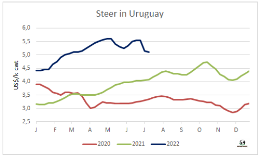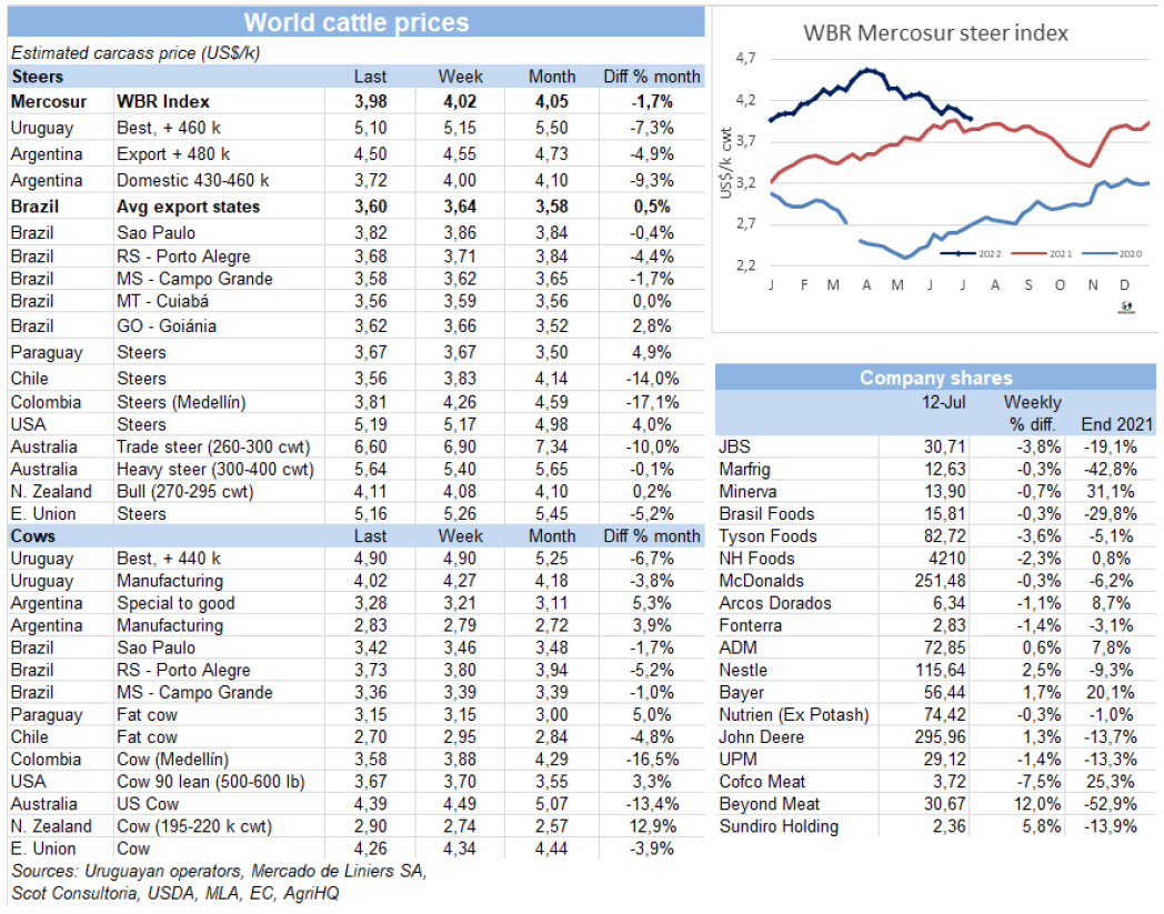 五家工廠暫停屠宰活動(dòng)加上一些還在進(jìn)行屠宰活動(dòng)的工廠減產(chǎn),導(dǎo)致牛屠宰量下降至2020年末至今一年半以來(lái)的最低水平。烏拉圭肉協(xié)報(bào)告,截止7月9日,一周內(nèi)牛屠宰量29829頭,環(huán)比減少了1萬(wàn)多頭,減幅約25%。同比減少了2.1萬(wàn)頭,減少了42%。屠宰量較上周下降是由于閹牛屠宰量下降了約28%至14561頭,母牛屠宰量較上周下降了17%至10506頭。小母牛屠宰量下降了17%至4297頭。屠宰量最高的工廠是Las Piedras,379廠,屠宰量 5022頭, Marfrig-Cledinor,394廠,屠宰量 3180頭和Ontilcor 439廠,屠宰量3,041頭。美麗華三家屠宰場(chǎng)屠宰量累計(jì)6553頭,Marfrig兩家屠宰場(chǎng)累計(jì)屠宰量5735頭。本周烏拉圭2廠,104廠等一些上周暫停的屠宰場(chǎng)恢復(fù)屠宰, 12廠,344廠,310廠仍未恢復(fù)屠宰。美麗華7廠屠宰持續(xù)至昨天,將暫停屠宰直至八月中旬。本周屠宰量將繼續(xù)保持低水平,不過(guò)將較前一周的低點(diǎn)有所提高。