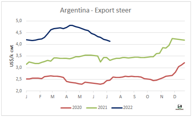 周二,受俄羅斯石油對(duì)歐盟國(guó)家斷供影響,歐元兌美元匯率跌至20年以來(lái)最低水平。投資者更青睞美元,自今年年初以來(lái)美元已經(jīng)上漲了近14%。阿根廷希爾頓臀腰肉價(jià)格受此影響下跌,過(guò)去一周內(nèi)下跌了500美元/噸。據(jù)市場(chǎng)參與者反映,13000美元/噸已經(jīng)是成交價(jià)的天花板了。有一位歐洲進(jìn)口商還價(jià)13000-13500美元/噸,本周初其他進(jìn)口商給新發(fā)船的阿根廷產(chǎn)品還價(jià)在12700-12800美元/噸。烏拉圭方面,受屠宰量急劇縮減的影響,供應(yīng)有限,參考價(jià)12500美元/噸。