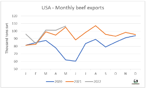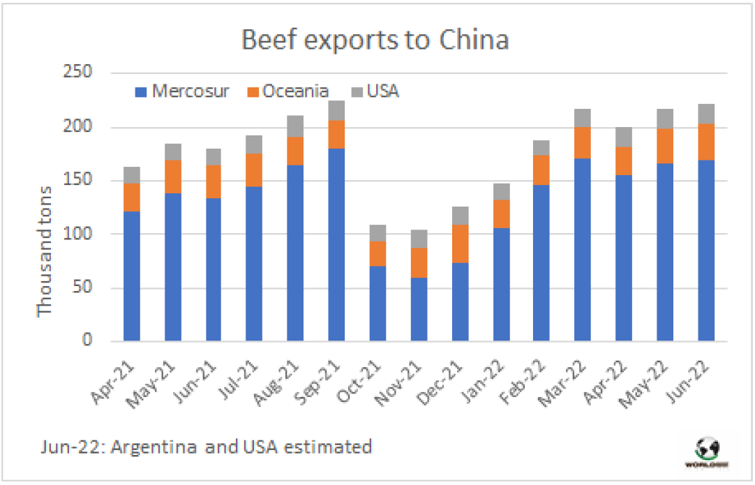 6月份,中國(guó)牛肉的主要供應(yīng)國(guó)發(fā)船量仍然很大。據(jù)估計(jì),南方共同市場(chǎng)、澳洲和美國(guó)牛肉出口量達(dá)22.1萬(wàn)噸,非常接近2021年9月22.4萬(wàn)噸的最高峰值。據(jù)估計(jì)從南方共同市場(chǎng)發(fā)貨量約17萬(wàn)噸,其中從巴西發(fā)貨量超過(guò)10.3萬(wàn)噸。此外,從澳洲發(fā)貨量3.3萬(wàn)噸,從美國(guó)發(fā)貨量1.8萬(wàn)噸,與3-5月的出貨水平相當(dāng)。這些貨物量大多在7月下半月到8月之間抵達(dá)中國(guó)。