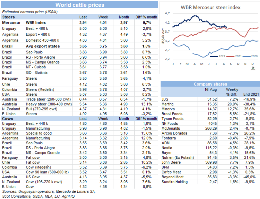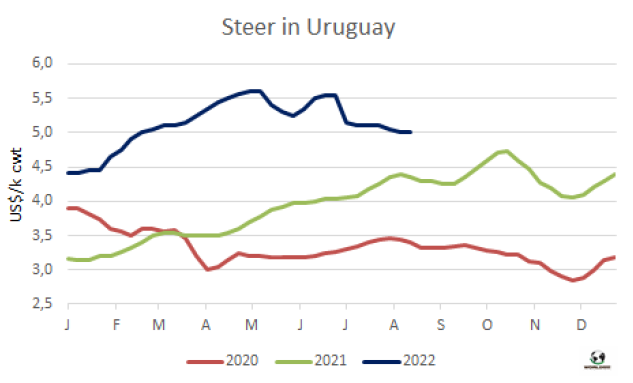 七月閹牛類型值連續(xù)兩周下跌,烏拉圭肉協(xié)報(bào)告每頭牛的閹牛類型值較上月下降了53美元,較五月的峰值下降了85美元。閹牛類型價(jià)值是烏拉圭肉協(xié)對(duì)一頭520公斤重,出成率54%的閹牛及其串種屠宰后產(chǎn)生所有產(chǎn)品的銷(xiāo)售價(jià)格的預(yù)估。烏拉圭肉協(xié)稱閹牛類型值下降是由于其組成成分的價(jià)格,其中下跌最明顯的是牛雜碎、牛副產(chǎn)品和鮮牛皮下跌最明顯。而屠宰場(chǎng)的活牛采購(gòu)價(jià)格較上月僅下跌了2美分至1550美元,因此工業(yè)附加值縮減了51美金/頭至235美元,因此工廠要想盈利必須覆蓋其他成本。