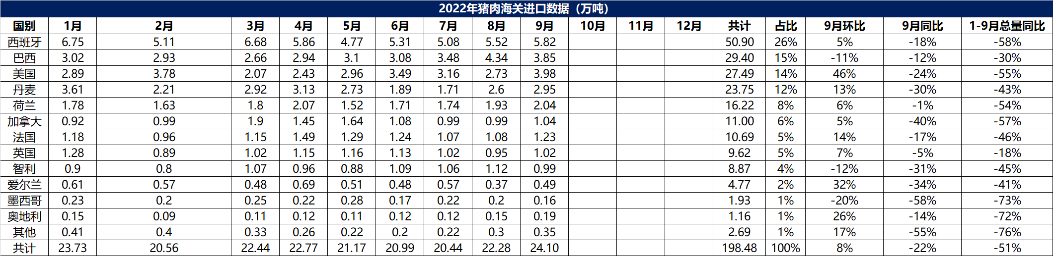 2022年1-9月冷凍豬肉進口數(shù)據(jù)