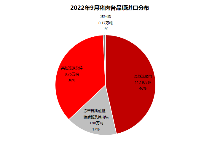 從進口品項看,9月豬骨類及其他凍豬肉和豬雜碎進口量之和占比83%。豬主塊肉和豬油脂進口量之和占比17%。