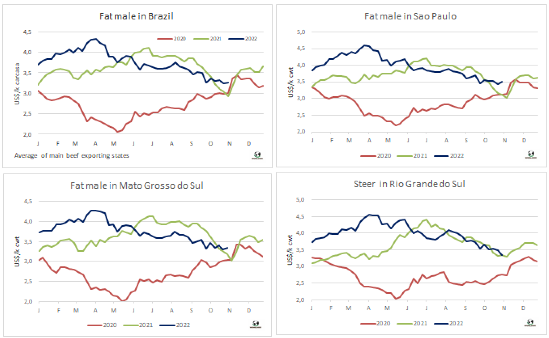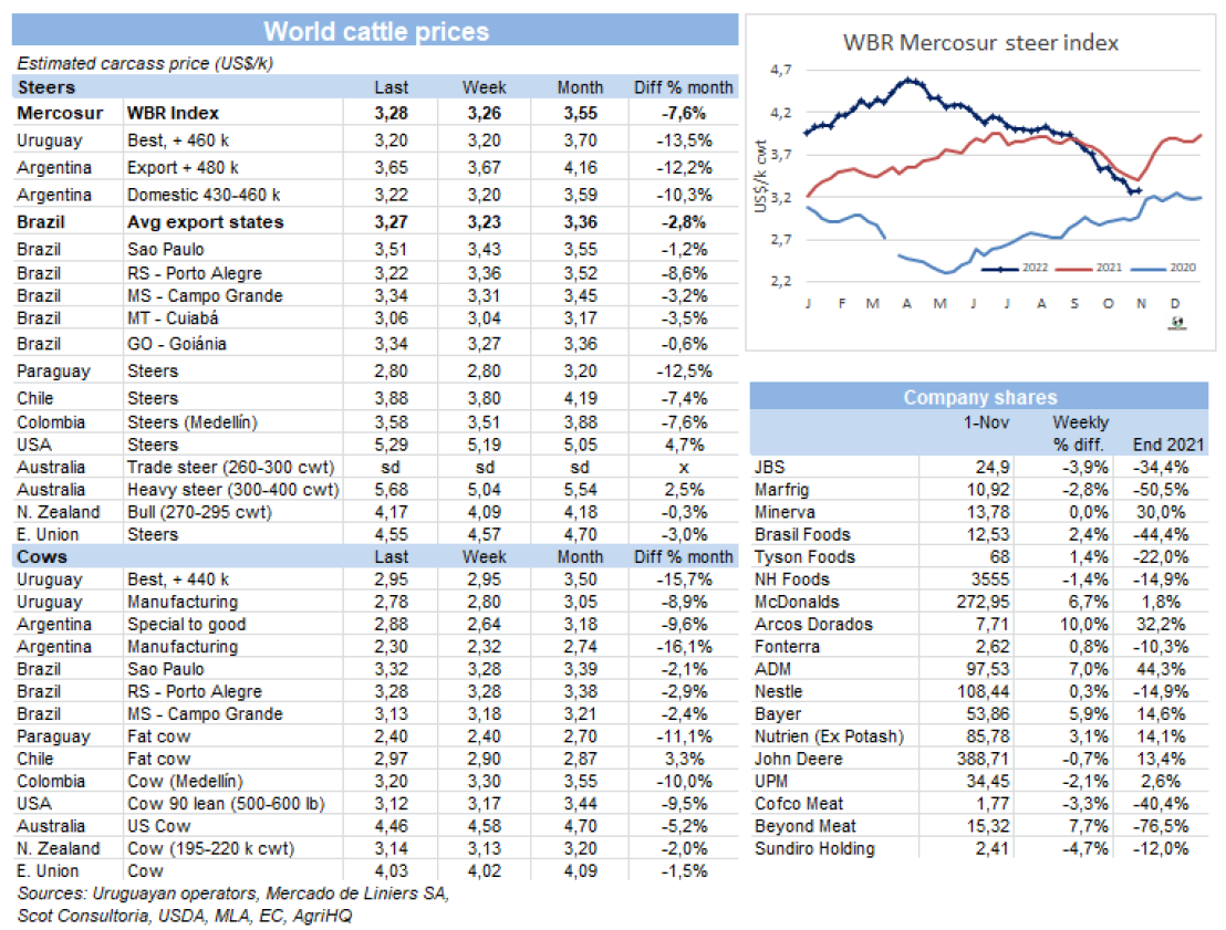 左派總統(tǒng)候選人Lula Da Silva在周日的選舉中獲勝,最初對巴西匯率產(chǎn)生了負面影響,之后雷亞爾升值,從而推高了南方共同市場牛價。本周南方共同市場閹牛價格指數(shù)上漲了2美分至3.28美元/公斤,打破了連續(xù)三周的下跌勢頭。本周巴西雷亞爾增值2.9%,中和了本地市場育肥牛價格的疲軟,美元價格上漲了4美分至3.27美元/公斤。阿根廷出口閹牛價格繼續(xù)下跌,本周下跌了2美分至3.65美元/公斤。烏拉圭和巴拉圭牛價保持穩(wěn)定,烏拉圭閹牛參考價3.2美元/公斤,巴拉圭參考價2.8美元/公斤。