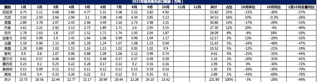 2022年10月中國主港豬肉進口量23.42萬噸,環(huán)比減少3%,同比減少20%。1至10月主港豬肉進口總量221.90萬噸,同比減少49%。值得關(guān)注的是,10月巴西豬肉進口量5.13萬噸,環(huán)比增長33%,同比減少0.3%,首次超過西班牙豬肉進口量,排名第一。