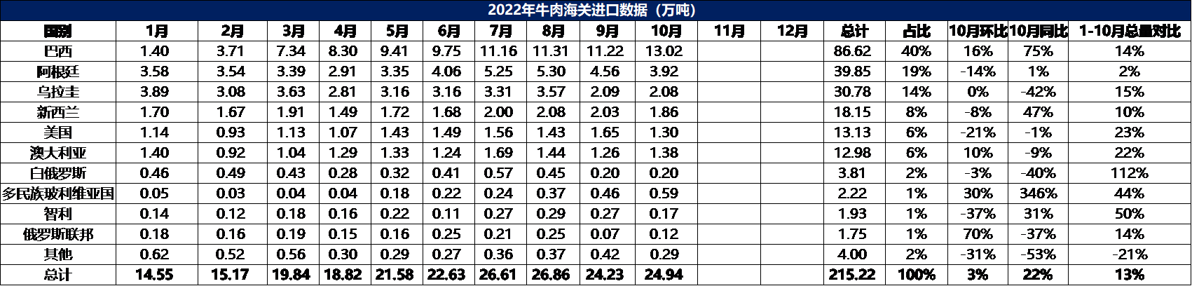 2022年10月中國主港牛肉進口量24.94萬噸,環(huán)比增長3%,同比增長22%。1至10月主港牛肉進口總量215.22萬噸,同比增長13%。從本月起從玻利維亞進口牛歐量躋身前十大牛肉進口來源國,超過哥斯達(dá)黎加、智利和俄羅斯,排名第八。