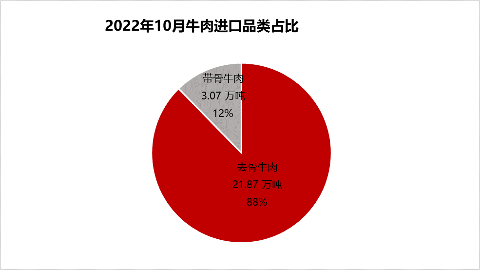 從進口品項看,帶骨牛肉進口量3.07萬噸,占比12%,去骨牛肉進口量21.87萬噸,占88%。