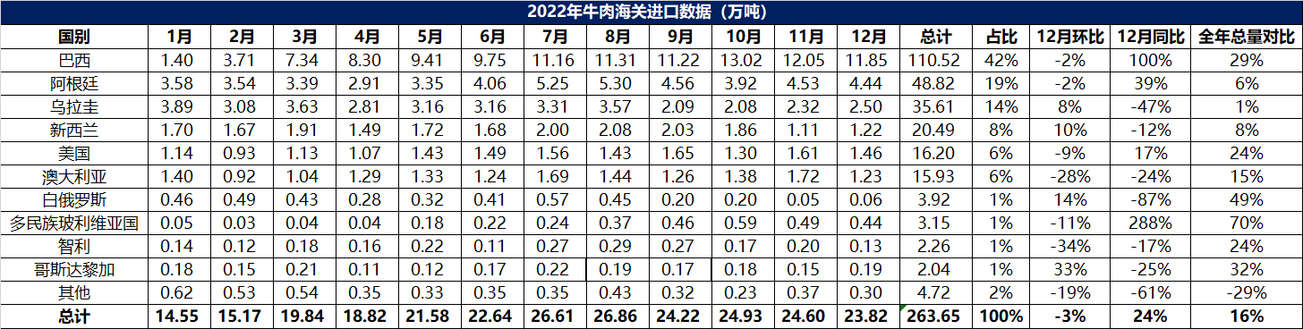 2022年1-12月中國(guó)主港牛肉進(jìn)口量263.65萬(wàn)噸,同比+16%。12月主港牛肉進(jìn)口量23.82萬(wàn)噸,同比+24%,環(huán)比-3%。2022年牛肉前十大進(jìn)口來(lái)源國(guó)依次是巴西、阿根廷、烏拉圭、新西蘭、美國(guó)、澳大利亞、白俄羅斯、玻利維亞、智利、哥斯達(dá)黎加。