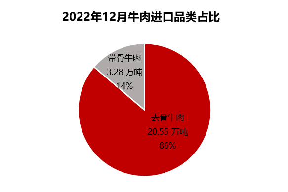 從進(jìn)口品類看,12月去骨牛肉進(jìn)口量20.55萬(wàn)噸,占86%,帶骨牛肉進(jìn)口量3.28萬(wàn)噸,占14%。