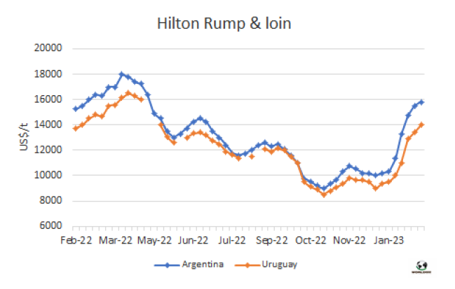 2023年開年至今希爾頓配額內(nèi)冰鮮牛肉價格保持爆發(fā)式增長節(jié)奏。上周阿根廷臀腰肉參考價15500-16200美元/噸,烏拉圭產(chǎn)品參考價14000美元/噸,一些進口商擔(dān)心新冠疫情給市場帶來不確定性,本周初還價低于10000美元/噸,烏拉圭Marfrig的CEO上周表示歐洲市場表現(xiàn)出更強的活力,需求比幾個月之前更好了。