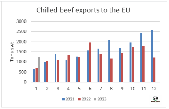 1月巴西向歐盟牛肉出口量持續(xù)增長。據(jù)外貿(mào)部數(shù)據(jù),1月巴西對歐盟牛肉出口量6081噸,較2022年1月增長了超過55%。增長主要表現(xiàn)在冰鮮牛肉出口上,增幅約74%至1247噸,是2018年以來最大的1月出口量。冷凍牛肉出口量也有顯著增長,增幅約51%至4834噸。