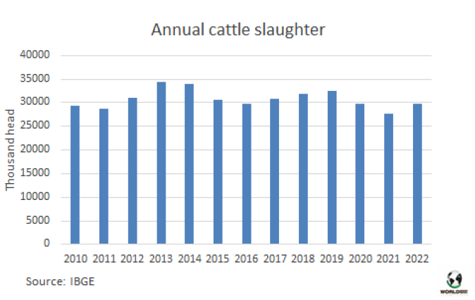 2022年巴西牛屠宰量小幅增長約200萬頭