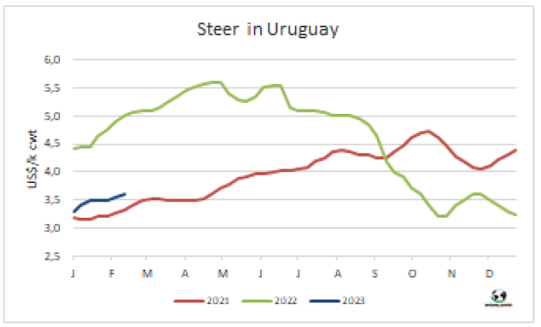 牛屠宰量連續(xù)五周增長,許多工廠為481配額加緊備貨。據(jù)烏拉圭肉協(xié)報告,截止一周內(nèi)牛屠宰量52432頭,較前一周增加了635頭,僅低于去年同期1200頭。481配額屠宰表現(xiàn)在閹牛的屠宰占比增大上。閹牛屠宰量29412頭,占總屠宰量的56.1%,與上周持平。小母牛屠宰量7456頭,較上周增長了2%,母牛屠宰量14824頭,較上周增長了3%。上周屠宰量最活躍的工廠是Las Piedras(379廠,5700頭),Marfrig-Tacuarembó (12廠,屠宰量5096頭),Minerva-pulsa(7廠,屠宰量4021頭)。美麗華3家工廠屠宰量10051頭,較上周增加了580頭。2月前11個工作日牛屠宰量共88260頭,較2022年同期減少了5.7%,1月屠宰量同比下降了27.8%。