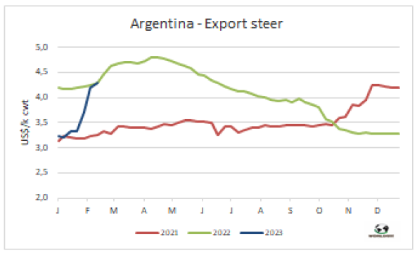 由于活牛價格急劇上漲,政府為控制不讓價格轉(zhuǎn)移到消費端者身上,給屠企施壓。周一政府重新啟動了一項“關(guān)愛肉”計劃,通過該計劃,企業(yè)必須承諾以低于當?shù)厥袌?span>30%左右的價格分銷七項部位肉。昨天,也就是周二,新加一項要求是這些公司必須每月貢獻1.5萬噸的部位肉。由于牛肉是食品和飲料類別中權(quán)重最大的商品,占消費者價格指數(shù)(CPI)的24%,經(jīng)濟部希望能影響2月的通貨膨脹率。與此同時,政府還對海關(guān)和聯(lián)邦公共收入管理局施加壓力。政府發(fā)布的一份報告稱,他們發(fā)現(xiàn)“在2021年至2022年期間,523份牛肉出口許可證存在虛開發(fā)票的操作”。報告指出,此類操作涉及22家出口商,“少開發(fā)票”的總額為1190萬美元(占這兩年出口額的0.2%)。一些公司本周無法獲得出口許可。此外,已經(jīng)廢除的2021年6月開始實施的肉類出口配額也被恢復(fù)。這一配額最初為2.9萬噸,并加上關(guān)稅配額,后來變得更加靈活,達3.9萬噸,而現(xiàn)在又回到了原來的數(shù)量。就此而言,為了讓國內(nèi)市場獲得便宜的肉類,出口企業(yè)正在讓步,例如將針扒和肩胛排除在出口禁令之外,建立一個特殊的牛肉出口用匯率——比官方匯率高出1美元,以及只允許擁有屠宰場的公司授予出口許可證等其他要求。