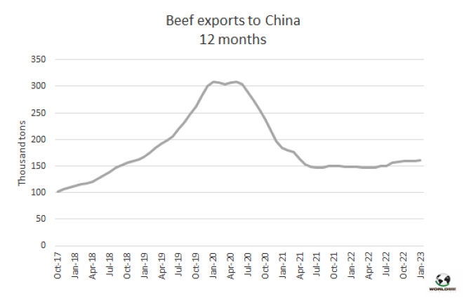 1月全球牛肉對中國出口量是一年以來最低