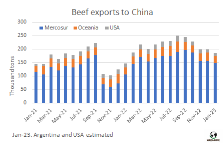 根據(jù)出口國的部分數(shù)據(jù)估計,中國牛肉市場的主要供應(yīng)國1月份對中國出口量約為18.5萬噸。這是自1 2022年1月以來的最低,比去年8月(25.2萬噸)減少了約6.6萬噸。南方共同市場國家出口了約14.9萬噸(阿根廷的數(shù)據(jù)為預(yù)估數(shù)據(jù)),而澳洲國家則向中國出口了2.6萬噸。去年12月,美國向中國出口不到1.1萬噸,預(yù)計1月份這一出口量不會大幅增長。