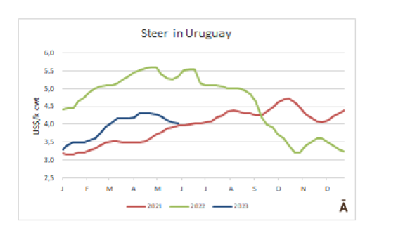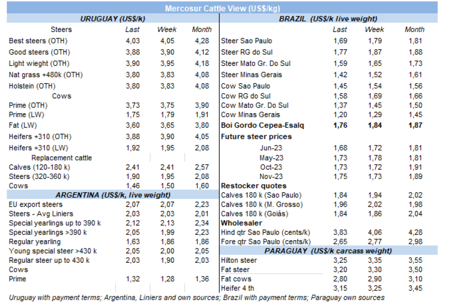 cwt,跌至1月以來最低水平。由于巴西價格大跌(-8%),加上巴西貨幣雷亞爾的貶值,巴西出口州的平均牛價由$3.09/kg cwt跌至$2.92/kg cwt。烏拉圭和阿根廷的市場的價格下降幅度要小得多。