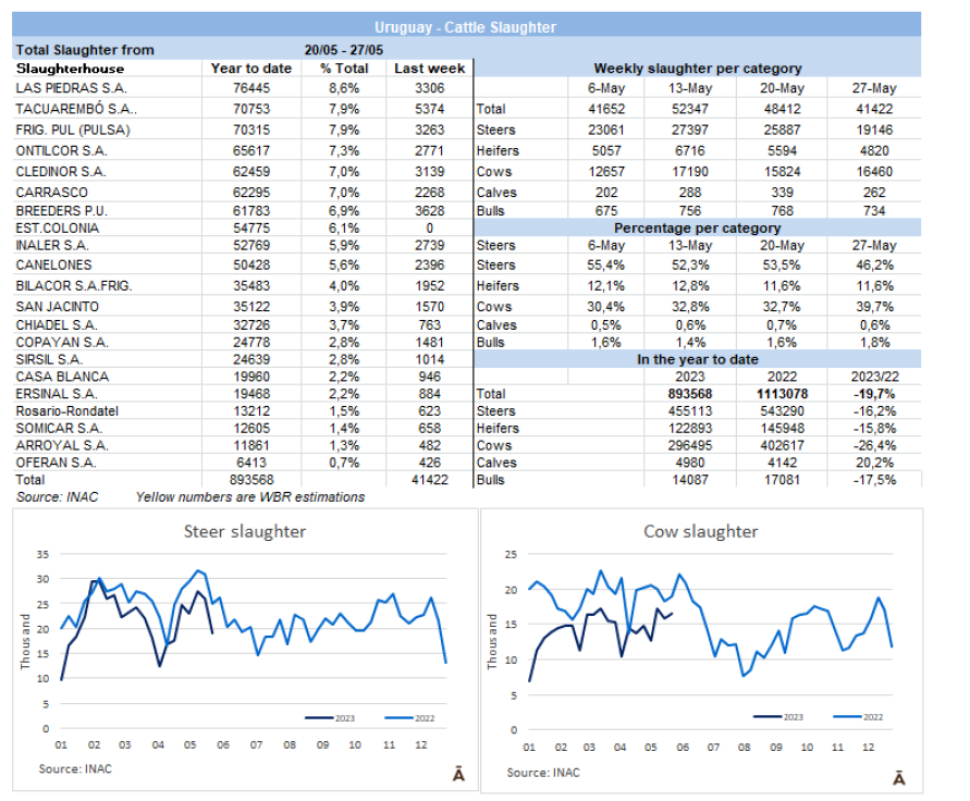 據INAC報告,上周牛的屠宰總量為41422頭,環(huán)比降低14.4%(大約7000頭牛)。由于481配額屠宰的結束,閹公牛明顯減少,從25,887頭下降到19,146頭。相反,母牛增加了近1000頭,保持在16460頭,而小母牛則下降到4820頭。