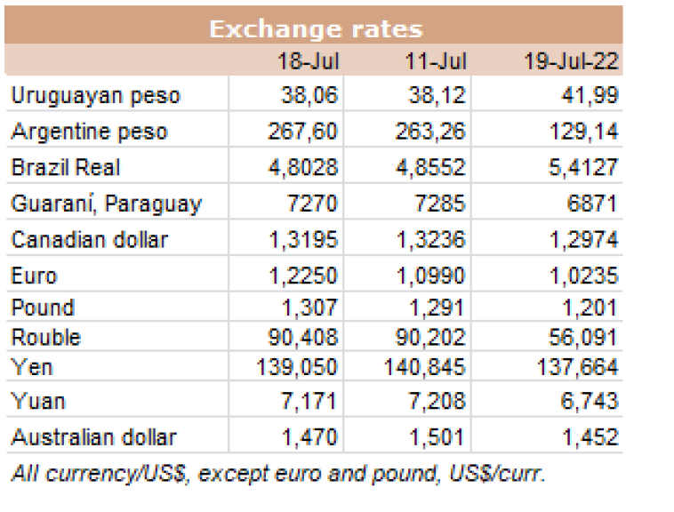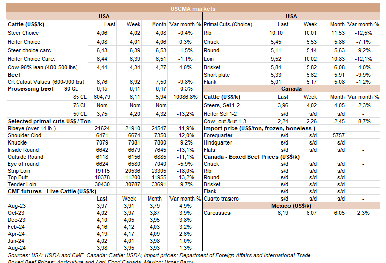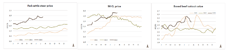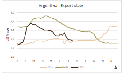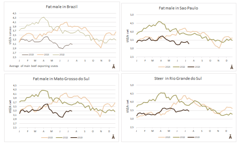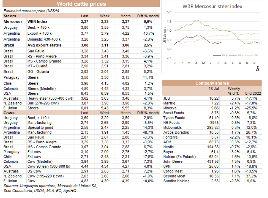 世界牛肉報告顯示過去一周南方共同市場閹牛價格上漲4美分至3.37美元/公斤。牛肉屠宰量增加,烏拉圭上漲了7%,巴拉圭上漲了6%,阿根廷市場保持穩(wěn)定,而巴西出口平均數(shù)減少了1%(-3美分)至每公斤3.08美元。雷亞爾對美元的升值(+1%)阻止了該地區(qū)牛價格的進(jìn)一步下跌。