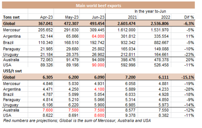 盡管國家統(tǒng)計和普查研究所(INDEC)的數(shù)據(jù)明天才能發(fā)布,根據(jù)SENASA衛(wèi)生服務(wù)局的數(shù)據(jù)估計,6月份帶骨去骨牛肉出口量為64171噸,比5月份相比高1%。中國的出口量有所下降,盡管其出口額在2023年仍然是迄今為止的第二高,超過50200噸。與此同時,與2022/23年關(guān)稅配額的關(guān)閉一致,對歐盟的出口量有所下降。與此同時,以色列的出口量有所恢復(fù),出貨量近4300噸,比上月增加183%。對智利和美國的出口也大幅增長,與上月相比分別增長了44%和32%