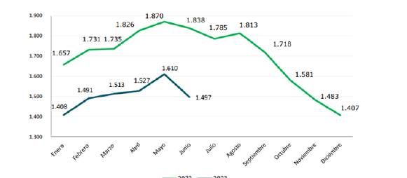 根據(jù)巴西環(huán)境與分析研究所上周發(fā)布的數(shù)據(jù)顯示,由于季節(jié)性調(diào)整,5月份的零售額比4月收縮了1%。與2022年5月相比,零售額也下降了1%,遠(yuǎn)低于分析專家關(guān)于1.6%復(fù)蘇的預(yù)期。預(yù)計7月份出口量將低于16萬噸。上周牛肉出口達(dá)到3.925萬噸,周增長5.01%。7月前十個工作日,牛肉出口約7.663萬噸,平均0.766萬噸/天,比2022年7月的日均水平低3.72%。Agrifatto稱:“通常情況下,前兩周的出貨量是最大的,7月迄今為止的統(tǒng)計數(shù)字表明,本月16萬噸的出口預(yù)期很難完成。