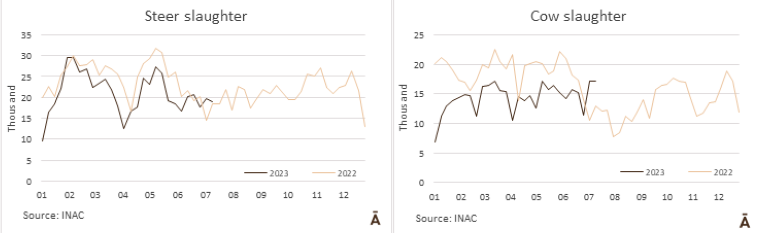 據(jù)INAC報道,在7月9日至15日的一周屠宰量42168頭牛,與七天前(42168頭)相比僅減少了1.8%。工業(yè)公牛增加了18893頭,與前一周相比下降了4.2%,而奶牛的數(shù)量17099保持穩(wěn)定。今年到目前為止,牛的屠宰總量為11.30億頭,比去年同期降低了18%。