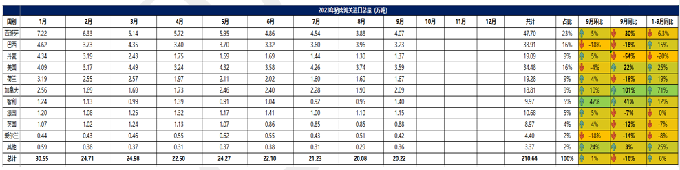 2023 年 9月中國主港豬肉進口量 20.22 萬噸,環(huán)比上漲1%,同比減少 16%。1-9 月主 港豬肉進口量 210.64 萬噸,同比增加 6%。從進口國別看,其中,從西班牙進口豬肉共計 47.7 萬噸,同比減少 6.3%,占比 23%。從美國進口豬肉共計 34.48 萬噸,同比增加 25%,占比 16%。從巴西進口豬肉共計33.91 萬噸,同比增加 15%,占比 16%。從丹麥進口豬肉共計 19.09萬噸,同比減少20%。從進口品項看,1-9月,凍帶骨豬前腿、豬后腿及其肉塊進口量 30.95萬噸,占比 15%。其他凍豬肉進口量95.72萬噸,占比 45%。其他凍豬雜碎 83.44 萬噸,占比 40%。豬油脂類進口量僅 0.49 萬噸。從 進口金額看,1-9 月,主港豬肉進口總額 50.95 億美金,同比上漲 15%。其中,進口西班牙 豬肉金額 12.02 億美金,同比持平。進口巴西豬肉金額 8.88億美金,同比上漲 33%。進口美國豬肉金額 8.27 億美金,同比上漲 22%。進口丹麥豬肉金額 4.65億美金,同比減少6%。