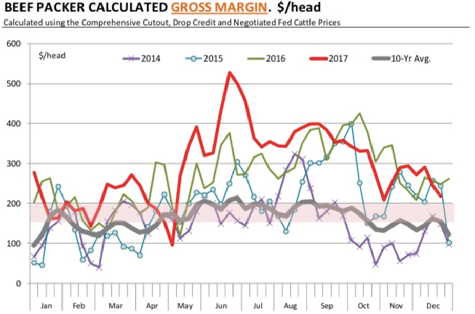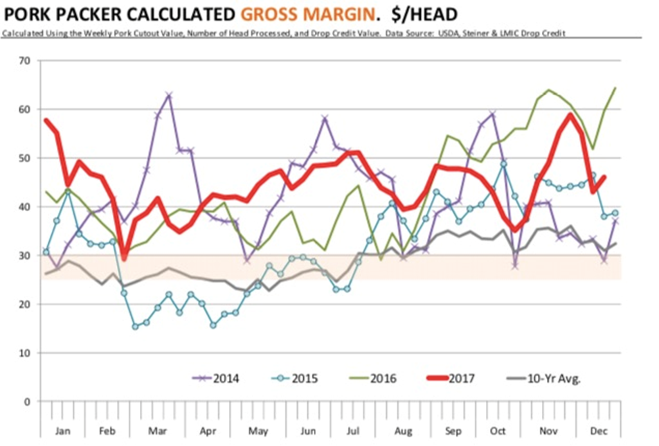 下附兩張圖表描繪了貿(mào)易商在開年的利潤率的不同情況。牛肉貿(mào)易商的利潤率在很大程度上被壓縮到今年年初,部分原因是寒冷的天氣對牛群的影響。在2017年,牛肉貿(mào)易商的利潤率非常好,對2018年的利潤率也仍然保持十分穩(wěn)健的預(yù)期。但是通常一季度的利潤都很低,今年也不會是個例外。當所有牛肉需求呈良好態(tài)勢,牛供應(yīng)將持續(xù)增加,也會驅(qū)動對牛肉分銷服務(wù)的需求。在最近兩周牛肉貿(mào)易商的利潤率被擠壓,我們認為2017的最后一周的利潤率非常接近于盈虧平衡點。如果精選級牛部位肉價格保持在205美元這個范圍,貿(mào)易商會支付120美元去買牛,剩下的也就接近盈虧平衡,而沒有賺到一點錢。生豬貿(mào)易商在開年的利潤率通常都很高。假期縮短的周數(shù)往往使生豬利潤率延遲,在開年會有一個很大的需求,而這個需求伴隨著市場積壓庫存的清空。寒冷的天氣并沒有對生豬造成多大損失, 因為都被移置于室內(nèi)喂養(yǎng),牛的情況也是如此。在產(chǎn)品方面,貿(mào)易商也非常頭疼節(jié)后后腿需求的暴跌。在這種情況下,生產(chǎn)商會為了保持生豬的流通運轉(zhuǎn)而提供給貿(mào)易商一個足夠大的利潤空間。這個庫存積壓的問題往往能被相當快的解決。在1月的下半月我們應(yīng)該會看到一個更加正常的市場狀態(tài)。接下來的挑戰(zhàn)是豬肉在國內(nèi)和國外渠道中的需求。期貨市場現(xiàn)在的價格走勢呈現(xiàn)出了在這個冬季和早春對豬肉的積極需求。去年我們看到了對豬部位肉和生豬需求的顯著激增,此趨勢一直持續(xù)到2月。這也很大程度上歸功于豬五花的高位價格。后腿價格最近持續(xù)疲軟,我們正看到更多的產(chǎn)品在現(xiàn)貨市場交易。和墨西哥的貿(mào)易持續(xù)穩(wěn)定,現(xiàn)在較低的后腿價格應(yīng)該能持續(xù)助力外銷。今年冬天期間生豬疾病的壓力是一個問題,一些報告顯示,豬藍耳病和豬流行性腹瀉病病例在增加。但情況與我們過去兩年看到的情況類似,目前尚未有太多影響。
