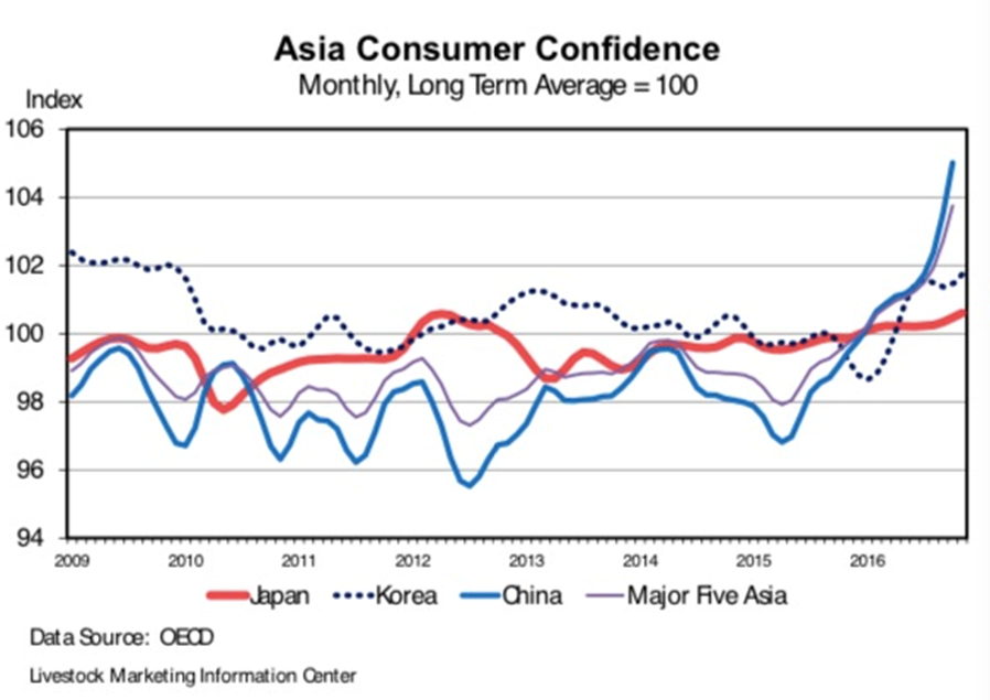 第三張圖表是亞洲消費者信心指數(shù)的總結(jié)??傮w上而言,亞洲消費者信心在2017年急速上升,中國最為迅速。南韓也高于100的指數(shù)水平。日本的消費者信心緩慢的接近100。此處,主要的五個亞洲國家數(shù)值是中國,日本,印度尼西亞和南韓的綜合指數(shù)。