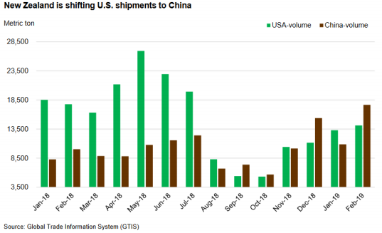 一月美國進(jìn)口牛肉量同比增加2%,達(dá)到2.53億磅,除了新西蘭其他主要供應(yīng)國都有增加,新西蘭進(jìn)口量同比減少了36%,自2012年以來最低,主要因為產(chǎn)量減少,再加上出口亞洲的量增加。預(yù)計2019年美國牛肉進(jìn)口量30.1億磅。