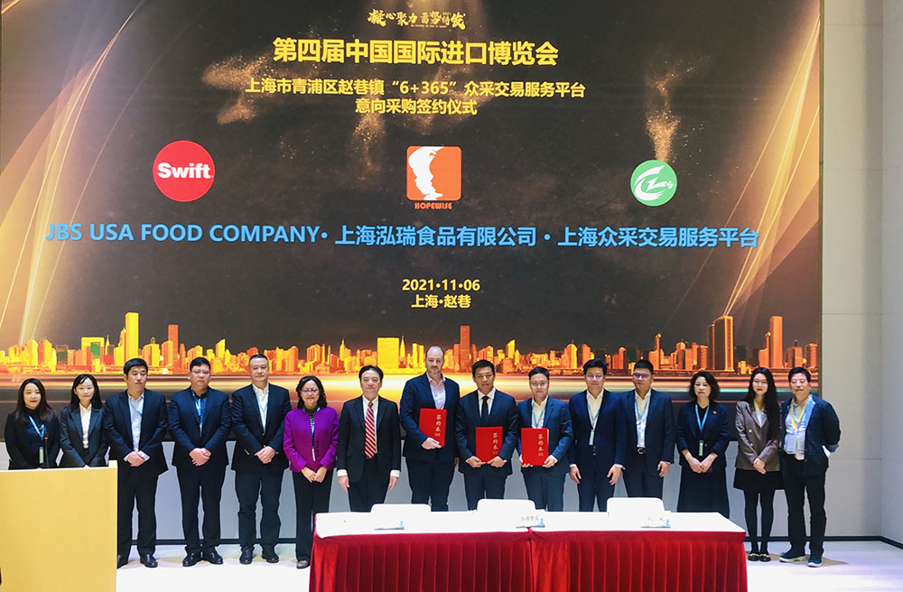 巴西集團美國公司的JBS SWIFT與北京泓睿&上海泓瑞食品有限公司和上海眾采企業(yè)發(fā)展有限公司簽約,共涉及9000萬美金的采購意向訂單。