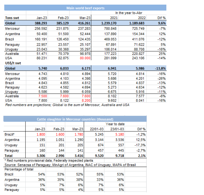 2023年前三個月,牛肉出口量達(dá)到15.6萬噸,出口額為6.542億$,與上年同期相比增長13.2%,出口額下降16.4%。本季度的出口量相當(dāng)于22.18萬噸帶骨牛肉。