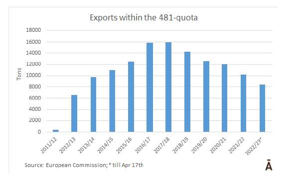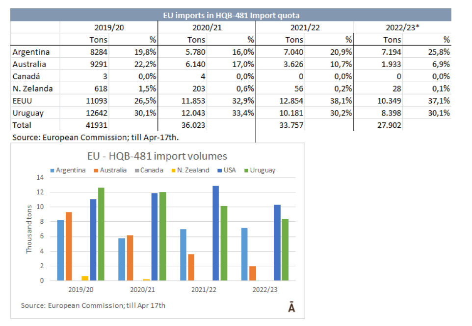 烏拉圭是第二大供應(yīng)國,在2022-2023年度達(dá)到8,398噸,超過了阿根廷(7,194噸)和澳大利亞(1,933噸)。新西蘭和加拿大可以給481配額出口,但他們并沒有使用配額。