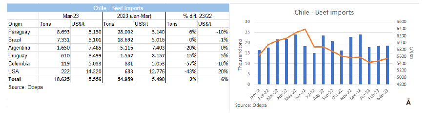 根據(jù)Odepa公布的數(shù)據(jù),智利在2023年前三個月進(jìn)口了54,959噸牛肉,均價為$5,490/噸。數(shù)量同比收縮2%,而價值中值下降6%。