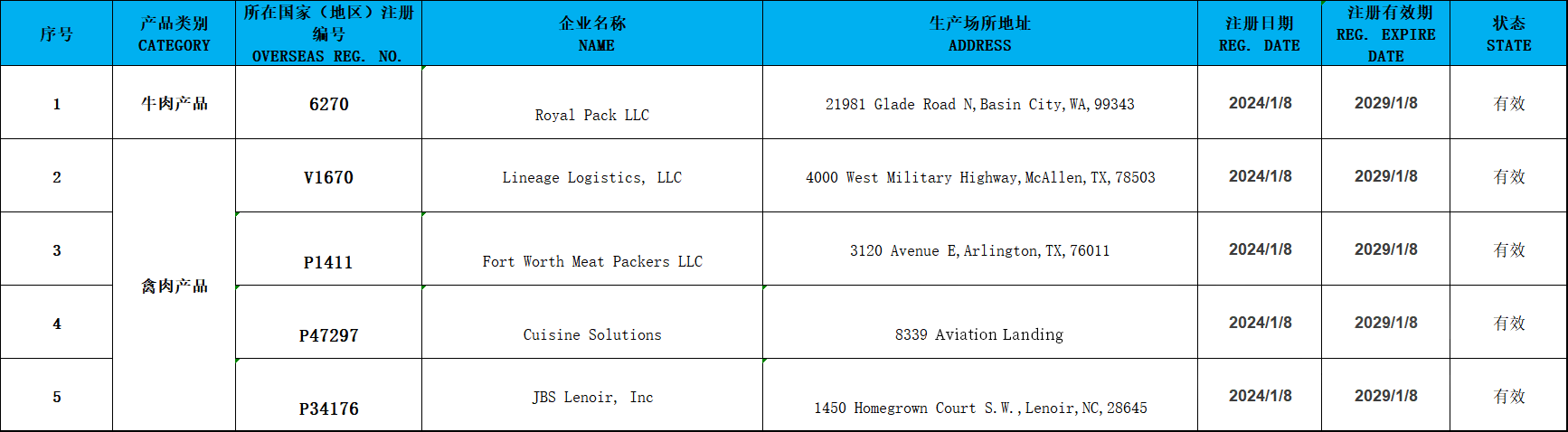 符合評(píng)估審查要求的國(guó)家或地區(qū)輸華肉類產(chǎn)品名單(2024年1月8日更新)
