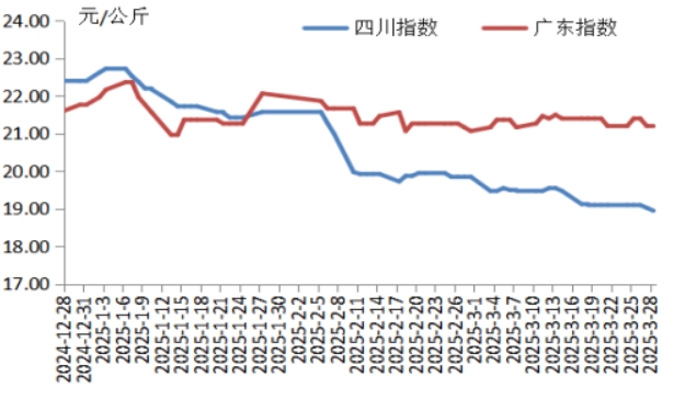 本周,廣東地區(qū)豬肉周均價(jià)為每公斤21.28元,環(huán)比下跌0.4%,同比下跌1.1%,結(jié)束了同比上漲趨勢(shì)。周前期,生豬供應(yīng)較為平穩(wěn),屠宰企業(yè)按需收購(gòu),生豬及豬肉價(jià)格以穩(wěn)定為主;周中期,散養(yǎng)戶和規(guī)模養(yǎng)殖場(chǎng)出欄節(jié)奏放慢,生豬及豬肉供應(yīng)短時(shí)收緊,支撐豬肉價(jià)格小幅反彈;周后期,周邊市場(chǎng)豬肉價(jià)格下跌,本地區(qū)經(jīng)銷商和消費(fèi)者壓價(jià)采購(gòu),屠宰企業(yè)為保證銷量降低售價(jià)。總體看,廣東地區(qū)豬肉周均價(jià)環(huán)比微跌。