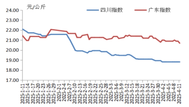 本周,四川地區(qū)豬肉周均價為每公斤18.83元,環(huán)比下跌0.2%,同比下跌1.8%,較上周漲幅收窄0.4個百分點。本地區(qū)散養(yǎng)戶出欄節(jié)奏較為平穩(wěn),豬肉供應(yīng)穩(wěn)定。清明假期結(jié)束后,豬肉消費疲軟,周均價微跌。