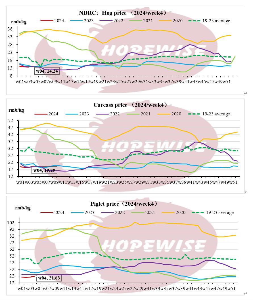 Live pig price of week 4 in 2024 was RMB14.24/kg, with an increase of 3.9% compared with last week but decline 7.59% compared with the same term of last year. The carcass price is RMB19.29/kg, with an increase of 4.3% compared with last week but decrease of 8.7% compared with last year. Due to the impact of a new round of rain and snow weather, transportation in the southern market was somewhat hindered. This had contributed to a rise in sentiment in the southern regions, and at the beginning of the week, pork price nationwide surged by over 14.5RMB/kg. However, after the increase of pig price, the follow-up demand from end customers was weak. Market expectations for future increased had diminished, leading to an increase in the enthusiasm for pig farming. Towards the end of the week, pork price was once again experiencing a narrow adjustment.