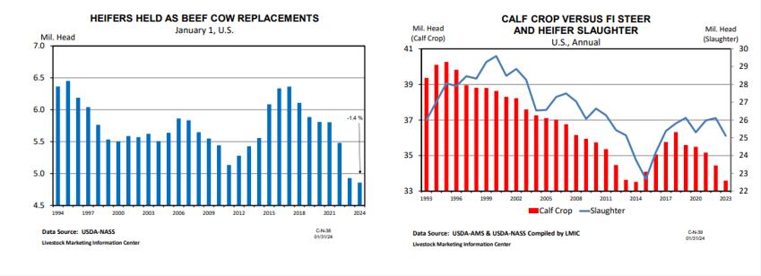 At the end of 2023, the USDA reported a 9% decrease in US red meat in cold storage, totaling 933.76 million pounds, driven by robust demand and reduced production. Beef witnessed an 11% decrease from the previous year, amounting to 485.127 million pounds, while pork decreased by 6% to 427.3 million pounds. Poultry supplies slightly exceeded the previous year at 1.127 billion pounds, with a notable 29% increase in turkey stocks compensating for a 6% decrease in chicken stocks. Additionally, US cattle feeders incurred an estimated loss of $133 per head in the week ending Jan. 20, with higher wholesale beef prices helping to alleviate packer losses by $100 per head, totaling $10. The total feed cost per head was $429, down about $6 from the previous week and significantly less than the feed costs for cattle sold during the same week a year ago.